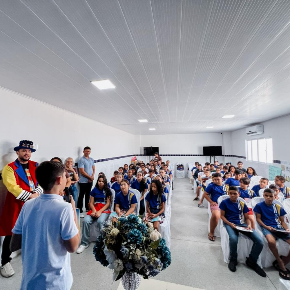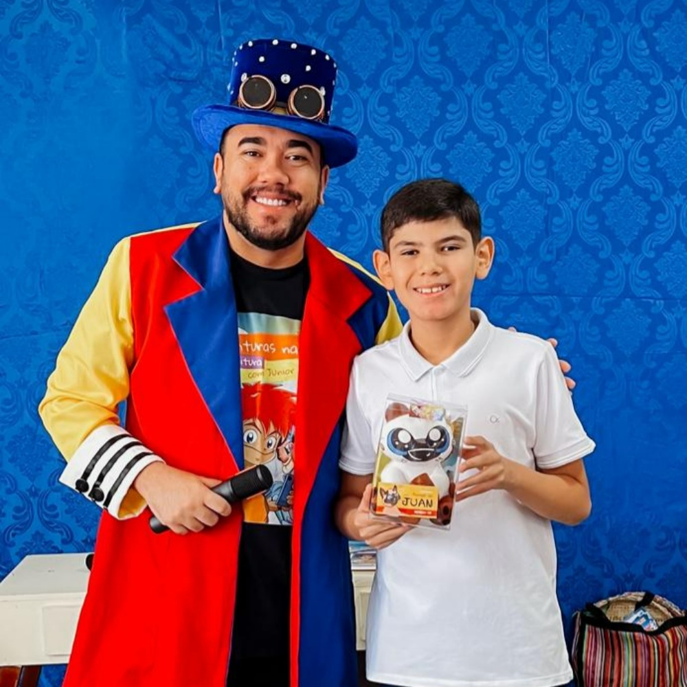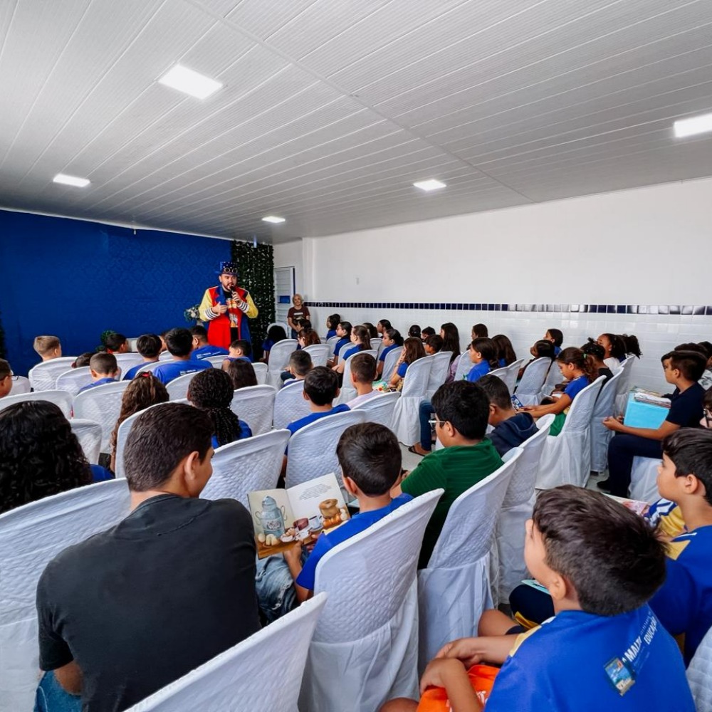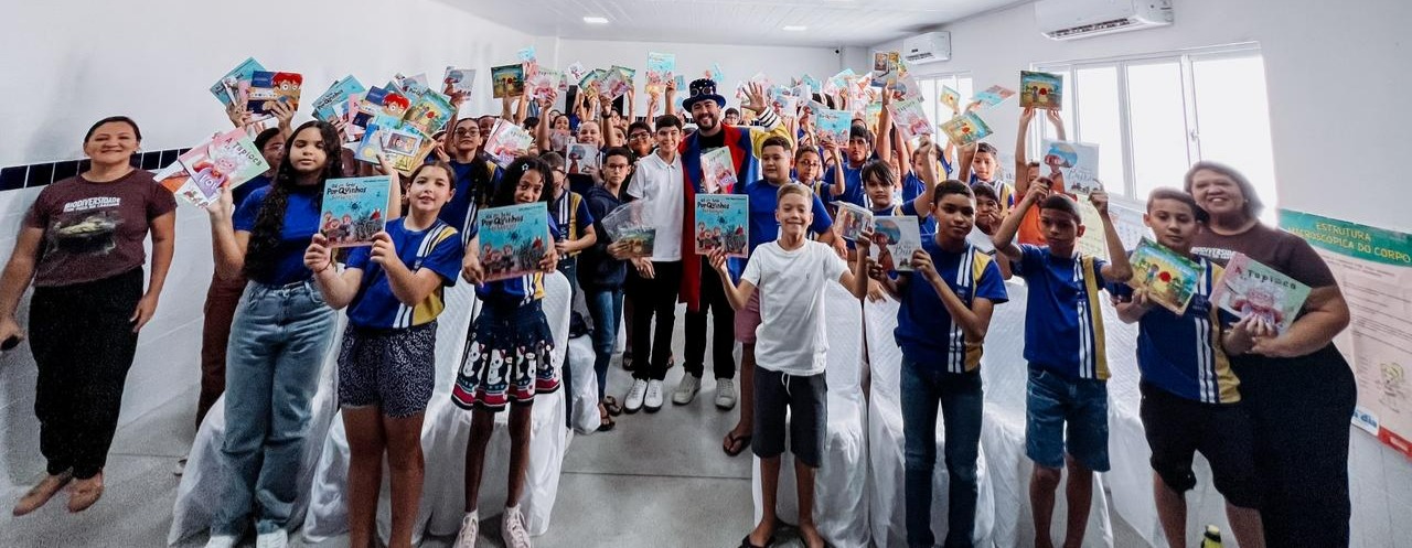 Na manhã desta quarta-feira (12), a Escola Cônego Joaquim de Assis Ferreira promoveu um momento especial de incentivo à leitura e à cultura: a Manhã Literária. A atividade reuniu os alunos dos 5º anos para uma programação repleta de diversão, aprendizado e inspiração, com a presença dos escritores Júnior Misaki e João Miguel. O evento contou com dinâmicas, brincadeiras, leituras compartilhadas e uma animada sessão de autógrafos.